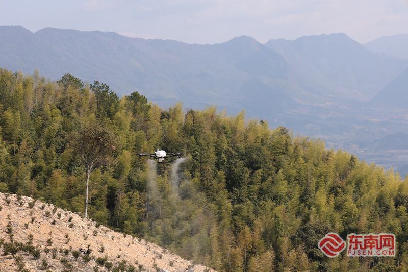 “它一次可以运输两百斤肥料,直接送到需要施肥的地点,精准投放。”陈崇杰说,“这么大面积的山林,纯靠人力运输,看天吃饭,施肥工作十天半个月都没办法完成,无人机几天就能完成,省时省力更省成本。它还能进行大规模的喷淋浇水,大大提高了种植养护的效率。”