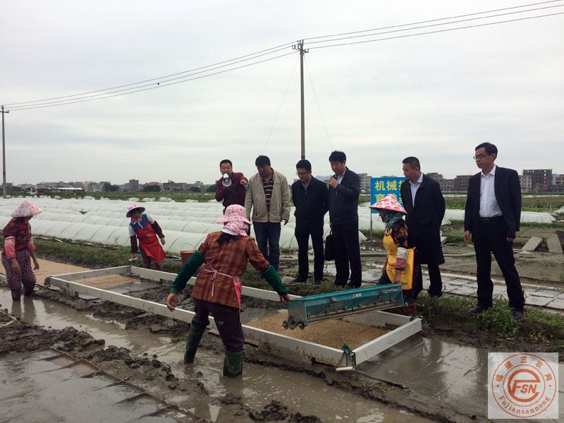 吴健明副市长带队观摩了沟边合作社秧田现场河泥浆机插秧播种和大型拖拉机现场机械化耕作演示、高速插秧机机械插秧现场以及室内水稻机械化流水线育秧、现代农业生产新机具、新技术推介展示。荔城区农机总站负责人现场介绍了机械化育插秧的优点,以及各种插秧机产品的性能特点和操作要领。