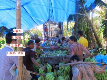视频中的香蕉为什么都是青的?王明月说,香蕉要在七八成熟的时候进行采摘。一般都会将香蕉置于冰水或凉水中降温并洗去蕉油,然后置于含有保鲜剂的水池中浸泡数分钟进行杀菌保鲜处理,晾干后用塑料袋包装、抽真空、装箱,然后马上装车运输至冷库贮存。