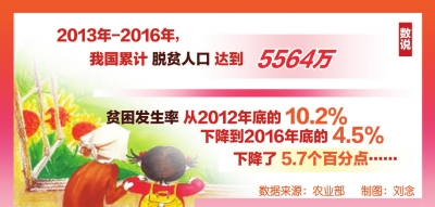 据统计,2013年-2016年,我国累计脱贫5564万人;贫困发生率从2012年底的10.2%下降到2016年底的4.5%,下降了5.7个百分点……这些数据见证了中国奇迹,也刷新了世界反贫困史上的减贫记录。