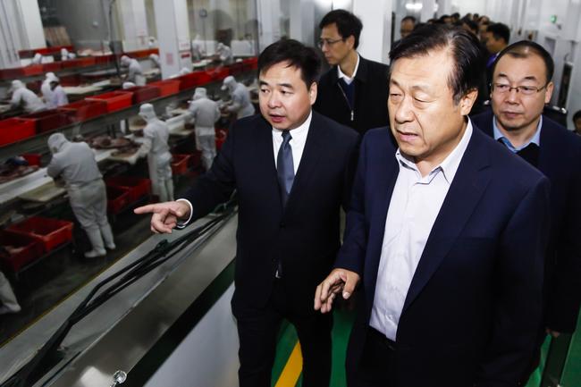图为农业部副部长于康震与全国农业系统各级畜牧兽医部门主管在陕西省渭南市蒲城县大红门肉类食品加工场现场观摩。