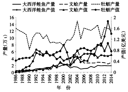 图1 1986—2014年美国主要海水养殖品种产出示意图