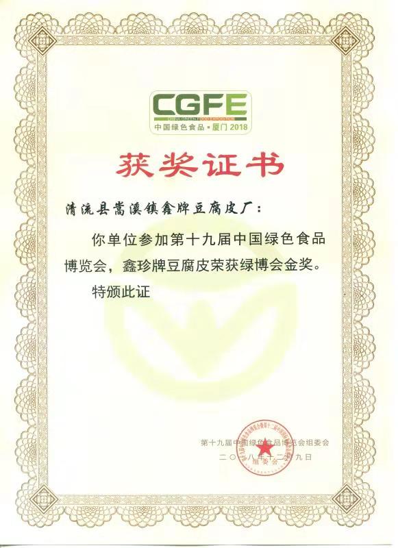清流鑫珍牌豆腐皮荣获绿博会金奖