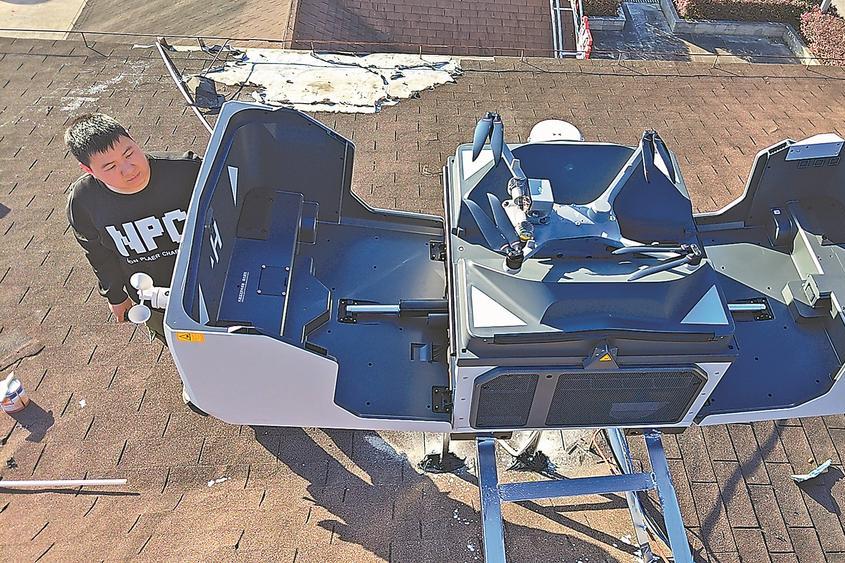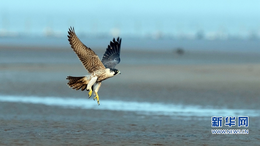 一只游隼在福建闽江入海口处沙洲上飞翔(4月25日摄)。