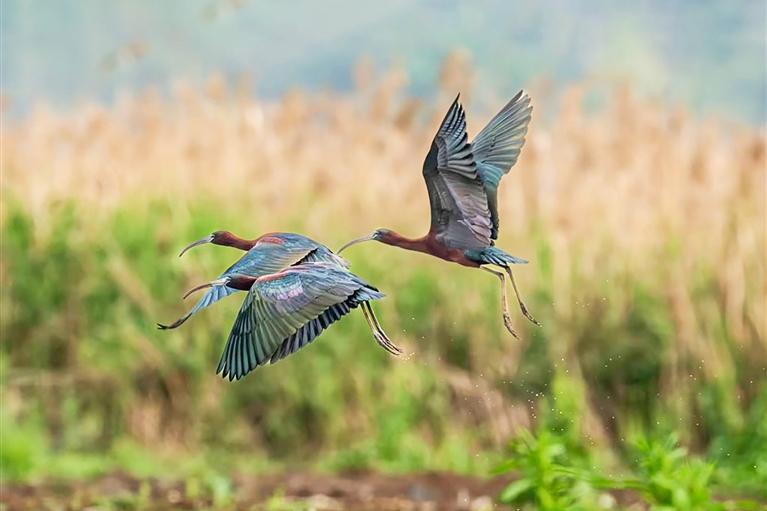 一只游隼在福建闽江入海口处沙洲上飞翔(4月25日摄)。新华社 梅永存 摄
