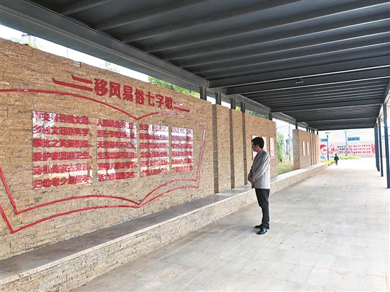 “中央号召倡文明,人民群众齐响应;党员干部先行动,移风易俗是心声;乡村文明讲科学,厉行节约当楷模;婚丧嫁娶反浪费,请找红白理事会;攀比之风要刹住,天价彩礼不可为;白事简办勿铺张,省下钱物敬爹娘;爱护家园讲卫生,生活垃圾不乱扔;垃圾处理要分类,蓝天碧水乐陶陶;诗礼传家古来训,道德人家必有邻;善行义举四德榜,风清气正润城镇;妇幼老少崇儒孝,活力张坂扬美名;全镇人民合心力,文明城镇创佳绩。”生态公园里,褐色石板墙上,大篇幅朗朗上口的移风易俗七字歌引得不少群众驻足吟诵。