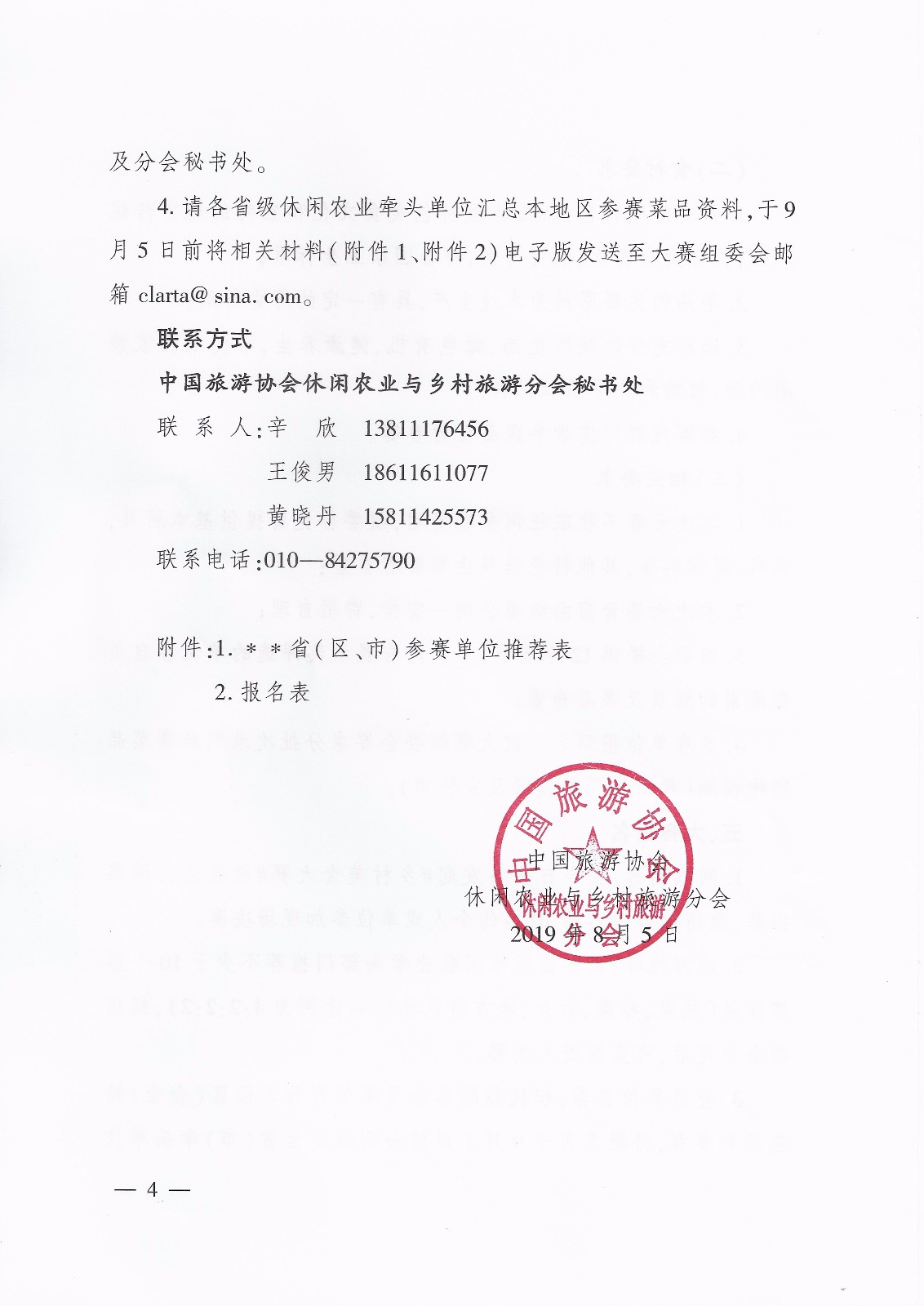 按照《关于举办2019中国乡村美食大赛的通知》(休闲农业分会〔2019〕11 号)要求,为深入挖掘乡村特色美食,弘扬乡村美食文化,培育一批地方品牌,提升乡村休闲旅游餐饮水平,促进休闲农业和乡村旅游产业提档升级,农业农村部乡村产业发展司与中国旅游协会休闲农业与乡村旅游分会定于9月16—18日在上海市举办2019中国乡村美食大赛。福建省启承三农文化发展中心受分会授权委托,联合福建省美丽乡村发展促进会牵头开展2019中国乡村美食大赛相关工作,共同推动福建省乡村振兴战略的实施。请我省休闲农业与乡村旅游四星级(含)以上企业、农家乐经营户(点)的经营业主或厨师、民间厨艺达人积极报名参与,并于2019年8月31日前将报名表提交至福建省启承三农文化发展中心。
