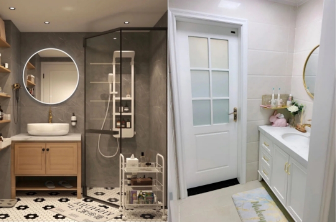 卫生间在设计时,洗漱台下的储物柜通常使用木质板材打造。若使用实木,实木不防水、怕潮,经常遇水容易腐蚀变形。若使用普通板材,由于其防潮性能较差,也容易出现开裂变形等问题。因此,对于卫生间内储物柜的基材选择,推荐使用防潮板。