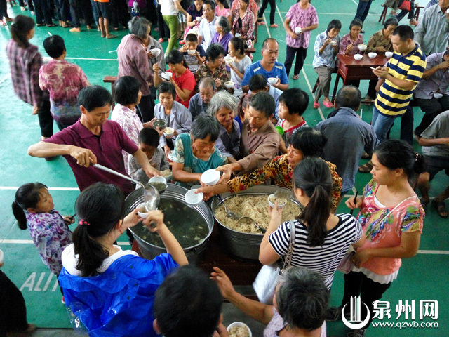 在永春县湖洋镇永春四中集中安置的群众,有序地排队吃午饭。康庆平 摄