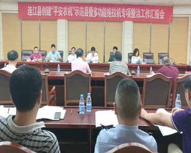 随后召开创建“平安农机”示范县暨多功能拖拉机专项整治工作座谈会,连江县公安局、公安局交警大队、县财政局、县安监局、县农机站负责同志;各乡镇乡镇长、派出所教导员参加了座谈会。座谈会上,伍斌副厅长专门向督导组汇报了今年全省农机安全生产工作及开展多功能拖拉机整治工作情况;连江县政府专题汇报了平安农机创建工作情况。赵瑞华副司长、孔亮副司长分别进行了工作点评,指出农机安全生产工作要做实做细,制度都有,关键在落实。