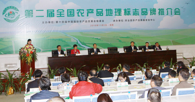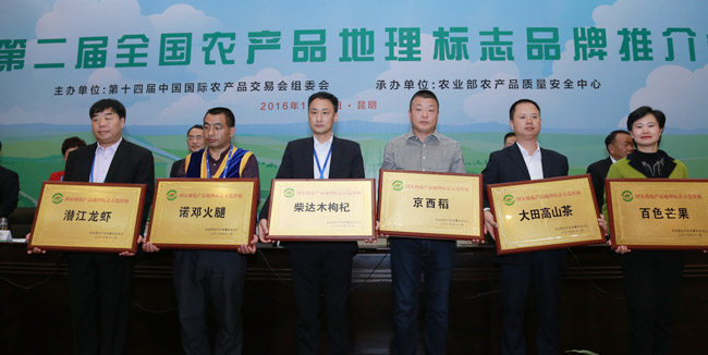 11月5日,由农业部农产品质量安全监管局牵头、农业部农产品质量安全中心组织的第二届农产品地理标志品牌推介会在云南昆明举办,农业部农产品质量安全监管局巡视员广德福等相关领导为百色芒果、大田高山茶、京西稻、柴达木枸杞、诺邓火腿、潜江龙虾6个国家级农产品地理标志示范样板授牌,并向农产品地理标志证书持有人、标志使用人及消费者代表赠送了《农产品地理标志50问》科普读物。