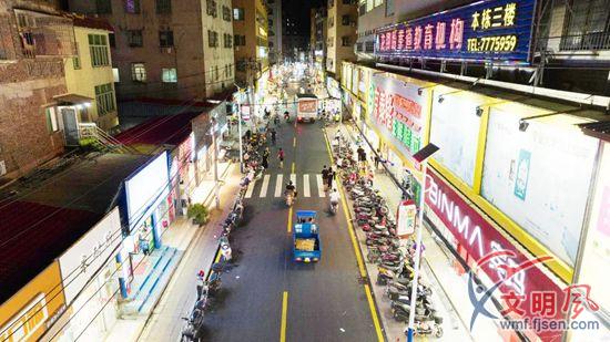 走在西柯街道官浔社区进村路上,只见夜色笼罩中的道路干净整洁,道路两侧的商店有了统一规格的店招,在灯光的映射下,五颜六色。店铺前的两轮车辆停车线内,摩托车、电动车、自行车等两轮车整齐划一地停着。偶有汽车经过,也很快地消失在道路尽头。