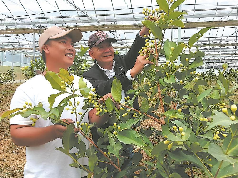 台农陈清淇(右)在察看莲雾“南果北种”长势。陈春花 摄