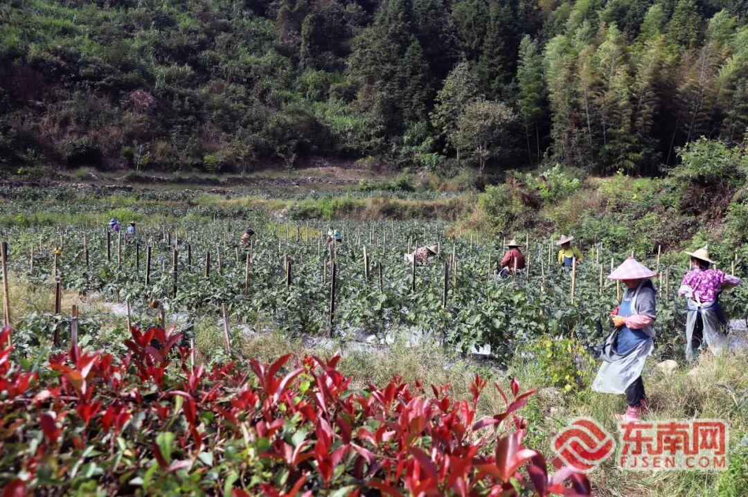 眼下,浦城县管厝乡党溪村的70余亩茄子喜迎丰收。10月29日,连片的田地里,村民们正忙着采收,紫亮的茄子于翠绿的叶片间若隐若现。不远处的棚子下,几位村民正熟练地将刚摘的茄子分拣、装箱,准备发往浙江龙泉等地。这片6月初开始采摘的茄子地,将持续至11月中旬,预计总产量60余万斤。