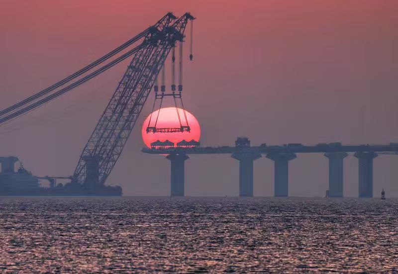 2月13日清晨,厦金大桥建设现场,一轮巨大的红日跃出海面,仿佛被施工吊臂“夹”起,定格住了工程巨构与自然霞光交相辉映的壮美瞬间。 陶卉摄