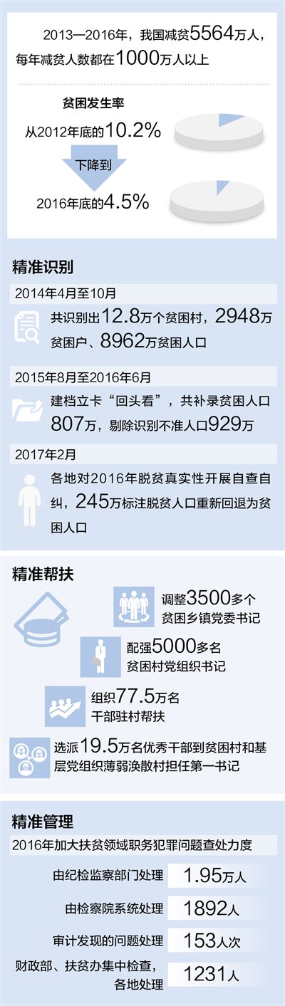 “绝不能让一个少数民族、一个地区掉队,要让13亿中国人民共享全面小康的成果。”五年来,习近平总书记几乎走遍全国14个集中连片特困地区,精准扶贫、精准脱贫基本方略在一个个贫困山乡落地生根。2013—2016年我国贫困人口每年减少超过1000万人,累计脱贫5564万人,相当于一个中等国家的人口总量;贫困发生率从2012年底的10.2%下降到2016年底的4.5%。精准扶贫、精准脱贫的中国智慧和成功实践赢得世界点赞。在向“第一个百年目标”的奋力冲刺中,脱贫攻坚的出色成绩成为一抹亮眼的底色。