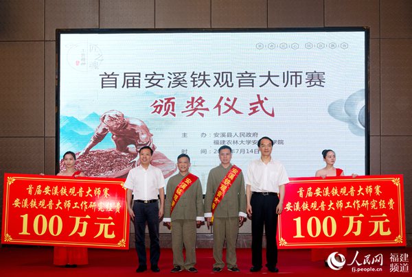 14日,备受关注的首届安溪铁观音大师赛举行颁奖仪式,2名“安溪铁观音大师”和8名“安溪铁观音名匠”共同登上荣耀的舞台,分别捧走100万元大师工作研究经费和5万元名匠工作研究经费。