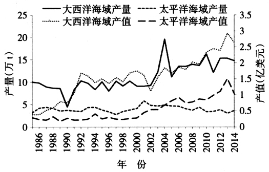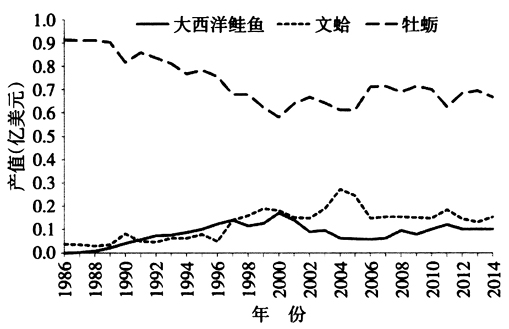 图1 1986—2014年美国主要海水养殖品种产出示意图