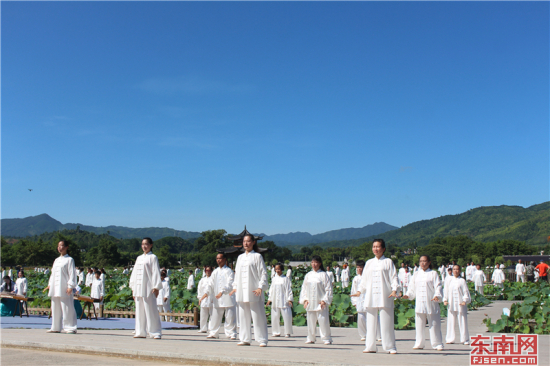 在建宁修竹莲文化主题公园1000余亩莲田中,来自全国各地500多名太极爱好者布阵八卦池内,伴随着《高山流水》的琴音,演绎太极拳,感受太极的呼吸吐纳,将身体与精神和谐统一,让生命与大自然完美结合,动静结合中传承太极之魂。