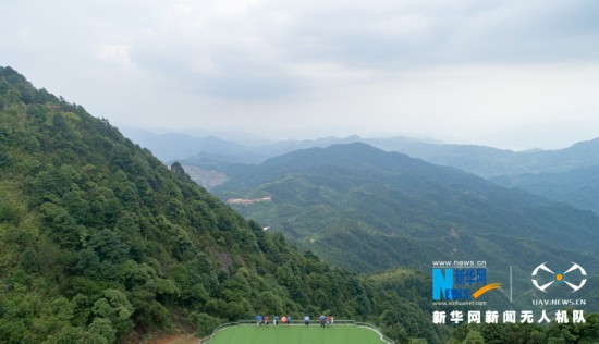 坪水村地处海拔约700米的深山中,村寨风景秀美。如今,这里已经建设了多处登山道和观景台,方便游客亲近自然。图为游客雨后撑伞,观赏绿色生态美景(无人机拍摄)。新华网 肖和勇 摄
