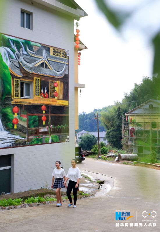 坪水村在美丽乡村建设当中,在村民新居外墙画上彩色图案,充满畲乡风情。新华网 肖和勇 摄