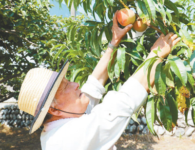 一名田切农产的员工正在摘桃子。