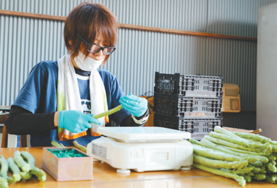 田切农产员工正在对刚收获的芦笋进行分级处理。