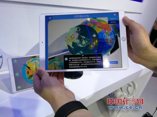 在线教育作业帮通过AR演示地理教学,气象现象、水文环境、宇宙行星等相关内容经现实增强后展现出来,极具趣味性和震撼力。杨秀峰/摄
