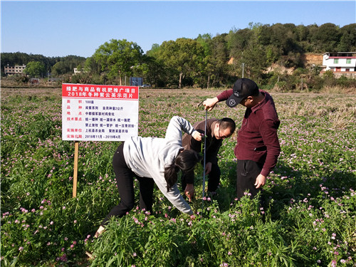眼下正值紫云英压青回田时节,农技人员在中都镇军联村鸡骨坑塅的100亩冬种紫云英示范片,随机选定了三处面积各为51.2㎡、21.5㎡、66.6㎡的田块,进行现场鲜草实割测产称重,并认真做好记录。通过测产验收,中都镇军联村紫云英示范片平均亩产鲜草2960.45kg,获得较好的收成,还田后土壤养分相当于亩增加纯N12.83kg,P2O54.54kg,K2O5.33kg。