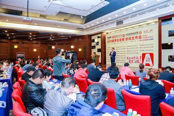 4月9日,2019春季全食展新闻发布会在京举行。著名营销专家、全食展组委会主席、龙品锡展览总经理王海宁,龙品锡展览副总经理祝宝威、全食展项目总监李俊,回头客食品集团董事长黄福阳,上海悠小君食品有限公司副总经理张利,北京安业森淼商贸公司总经理王辰,以及来自全国各地的新闻媒体、食品企业家、食品经销商等200余名代表,出席了此次新闻发布会。