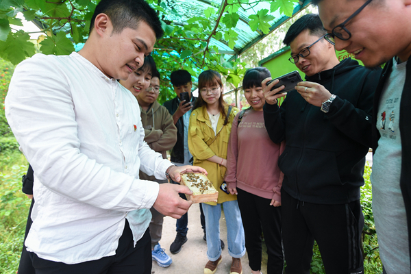 邱凯(左一)在种蜂培育基地向回乡创业的青年们介绍种蜂培育技术。新华社 徐昱 摄