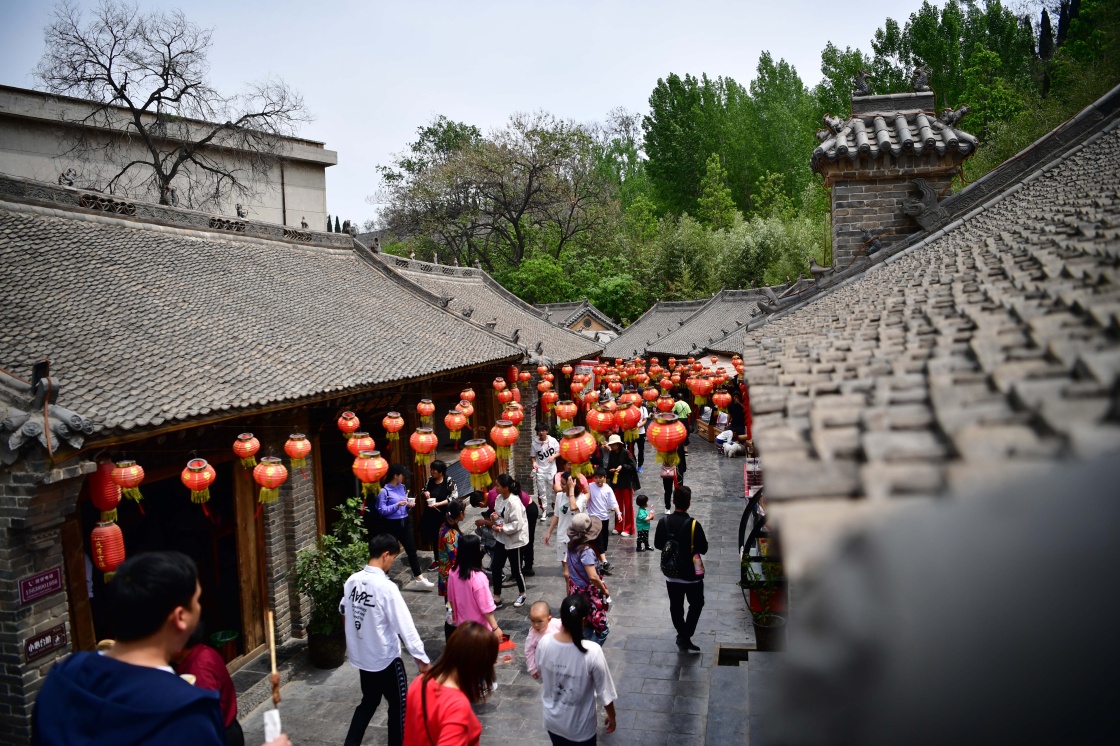 5月3日,在河南省巩义市竹林镇,游客在长寿山景区风情古镇美食街参观游览。