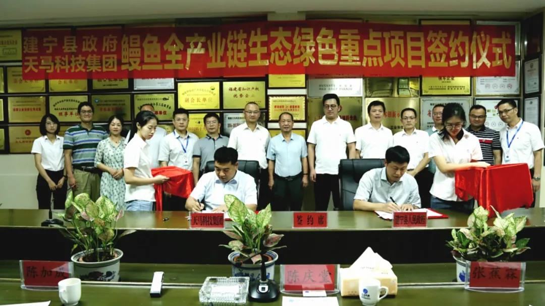 9月16日,天马建宁鳗鱼全产业链生态绿色重点项目签约仪式在天马科技集团总部正式举行,建宁县县长陈显卿,天马科技集团董事长陈庆堂代表双方签署协议,建宁县委常委、统战部部长黄立辉,建宁县政府相关部门、镇有关负责人,天马科技集团执行总裁陈加成等领导共同出席并见证签约仪式。