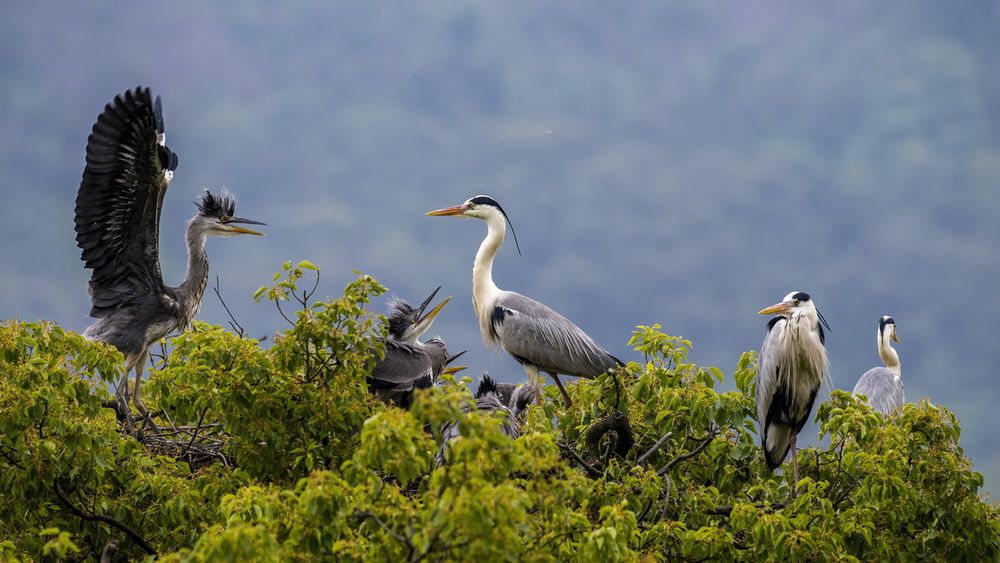 5月2日,福建省罗源县碧里乡濂澳村后山的树丛中,苍鹭在嬉戏。新华社 梅永存 摄