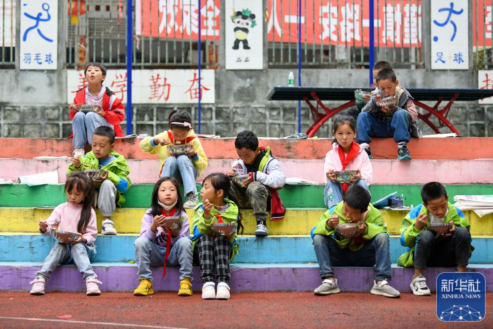9月7日,学生在石棉县草科乡中心小学内吃午饭。