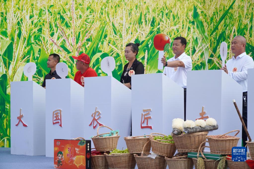 9月14日,在山东省乐陵市举行的全国农民技能大赛(种植能手)现场,选手在展示自己家乡的农产品。