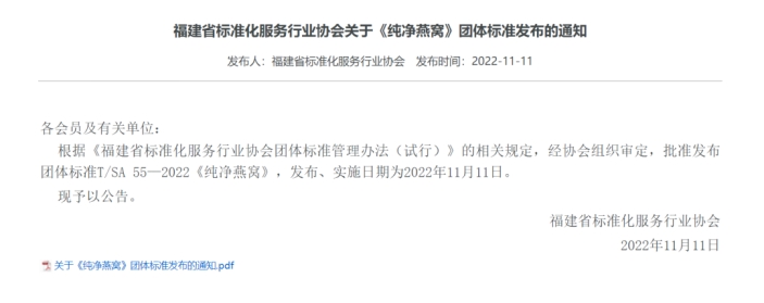 近日,《纯净燕窝》团体标准正式发布。该标准归口于福建省标准化服务行业协会,由我会会员单位方家铺子、好窝燕窝牵头,联合中国农业大学、厦门海关技术中心、央广幸福购物(北京)有限公司等多家权威机构、国内高校和科研机构共同起草。该团标的发布标志着中国首个纯净燕窝团体标准的诞生,在行业发展史上具有里程碑的意义。