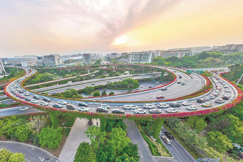 15日,福州市仓山区双湖互通高架桥上,落日余晖中,道路两侧三角梅在春日里竞相绽放,带给市民“一路生花”的视觉享受,让城市立交桥成为一道美丽的风景。近年来,福州市加快建设城市综合交通体系,持续实施交通缓堵工程,着力打造“1小时通勤都市圈”,辐射带动周边一体化发展。