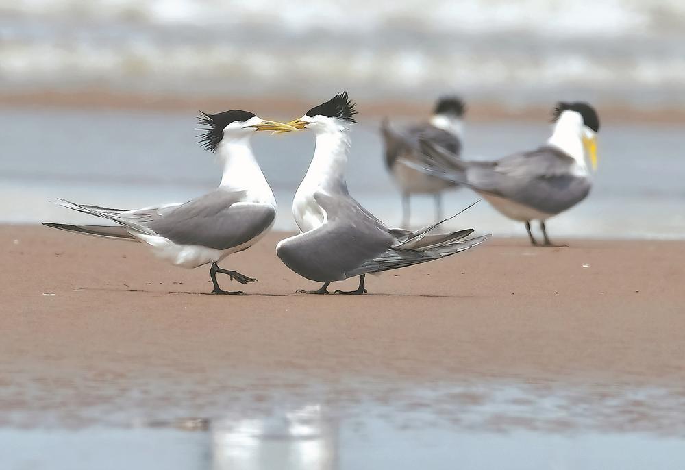 22日,国家二级保护野生动物大凤头燕鸥在闽江河口湿地沙滩上嬉戏。