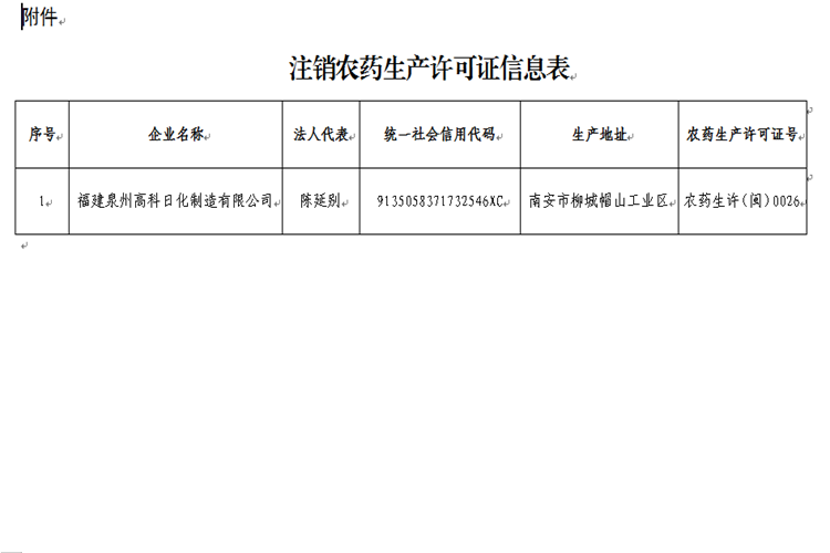 附件:注销农药生产许可证信息表